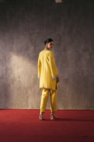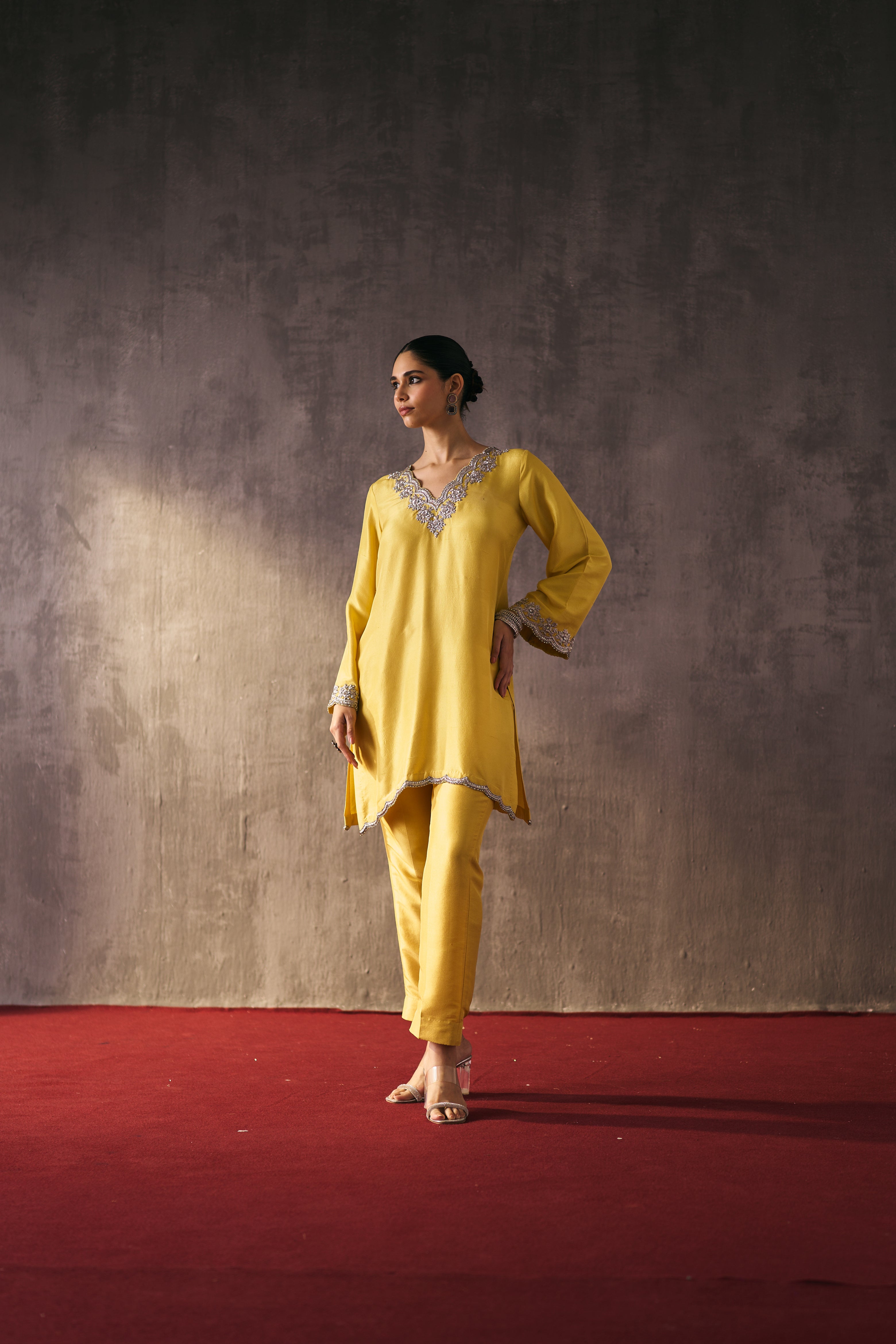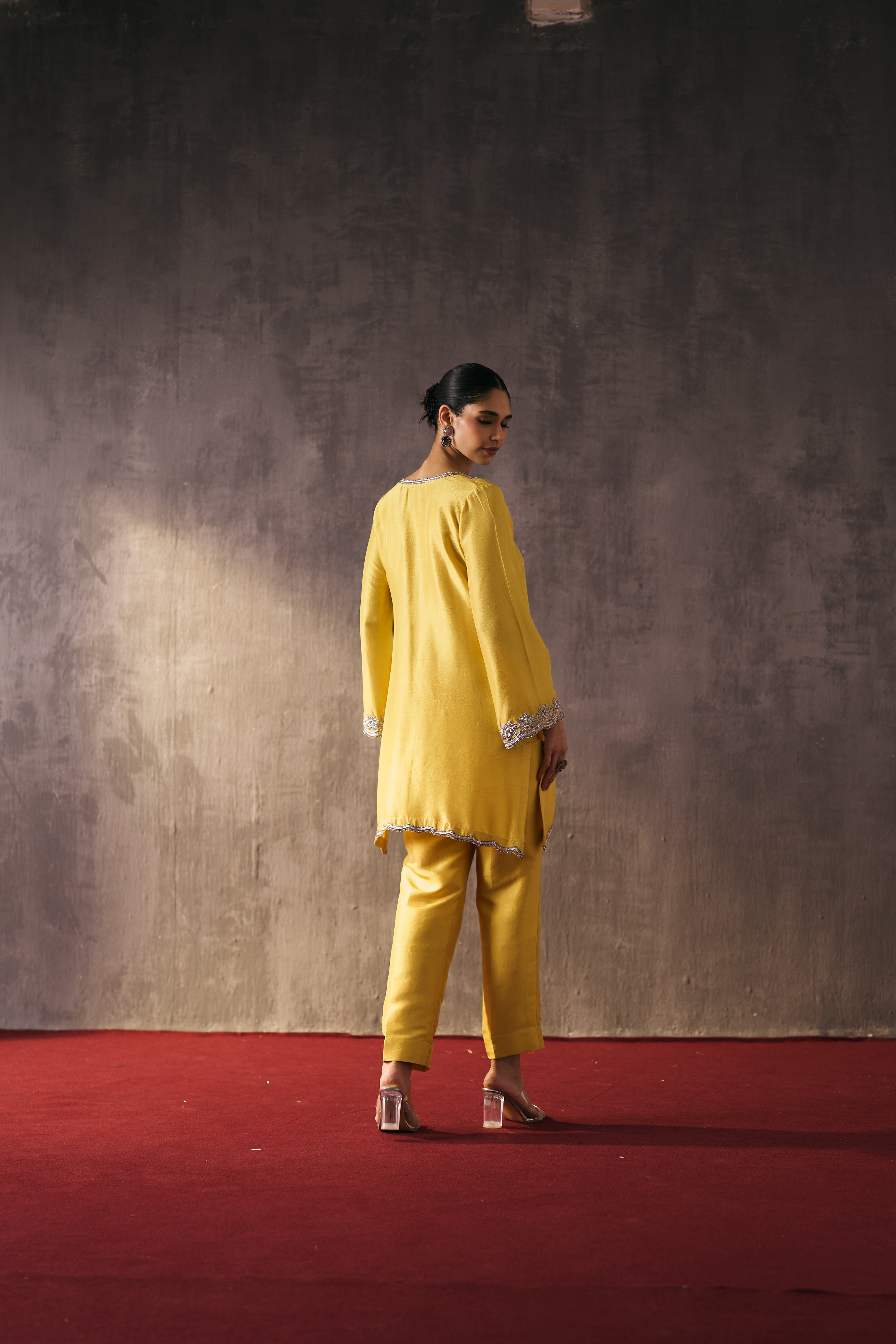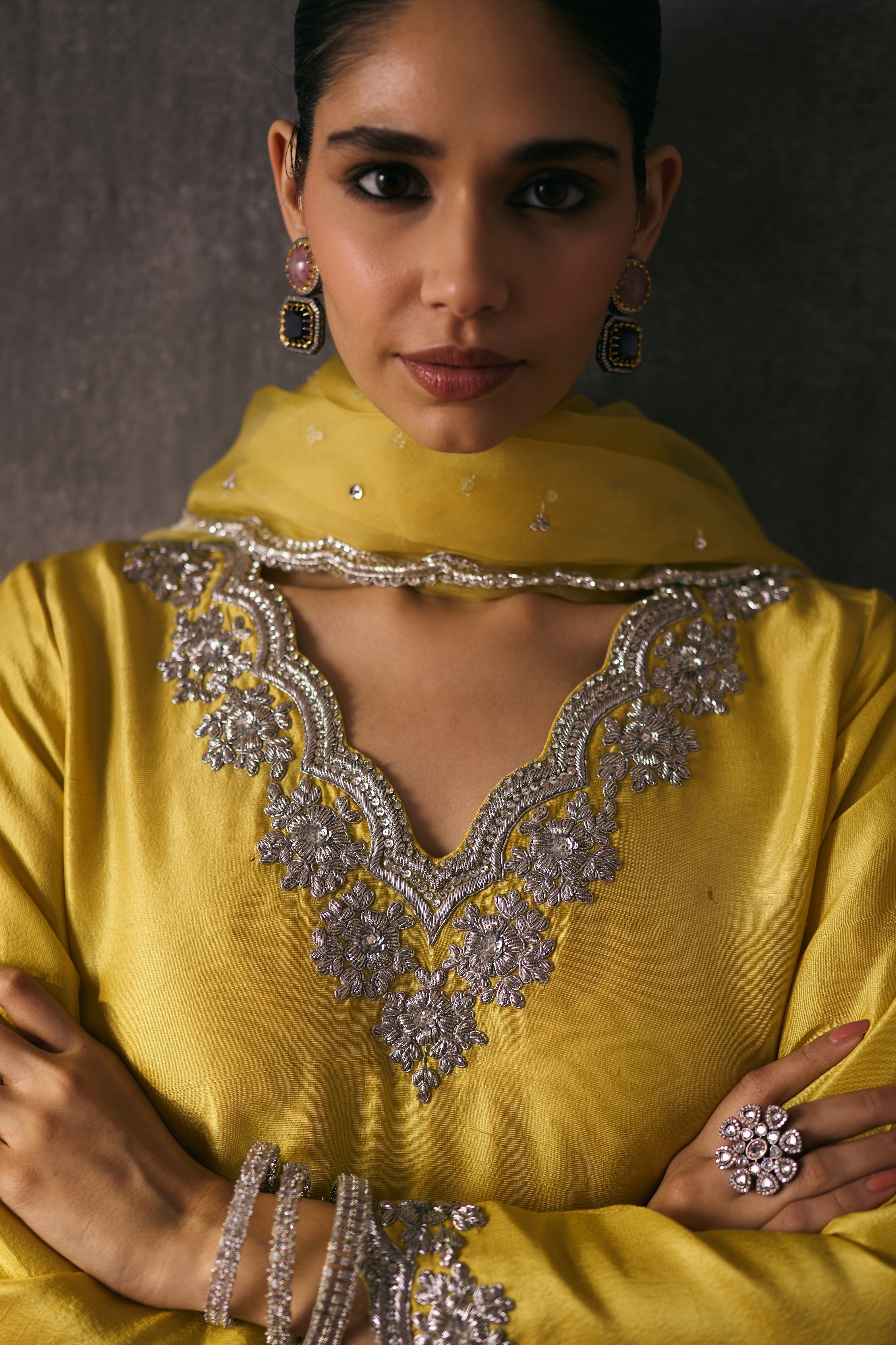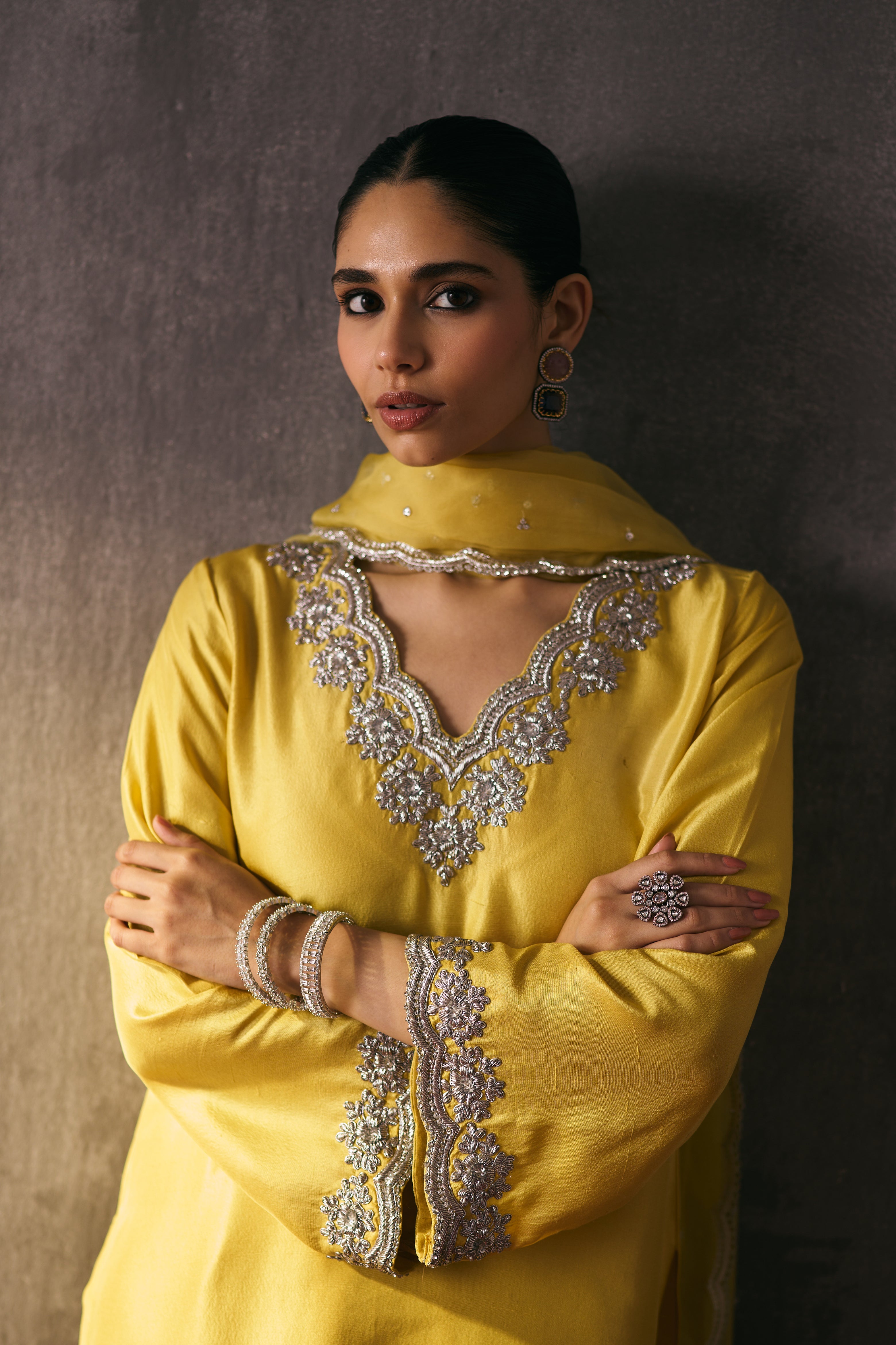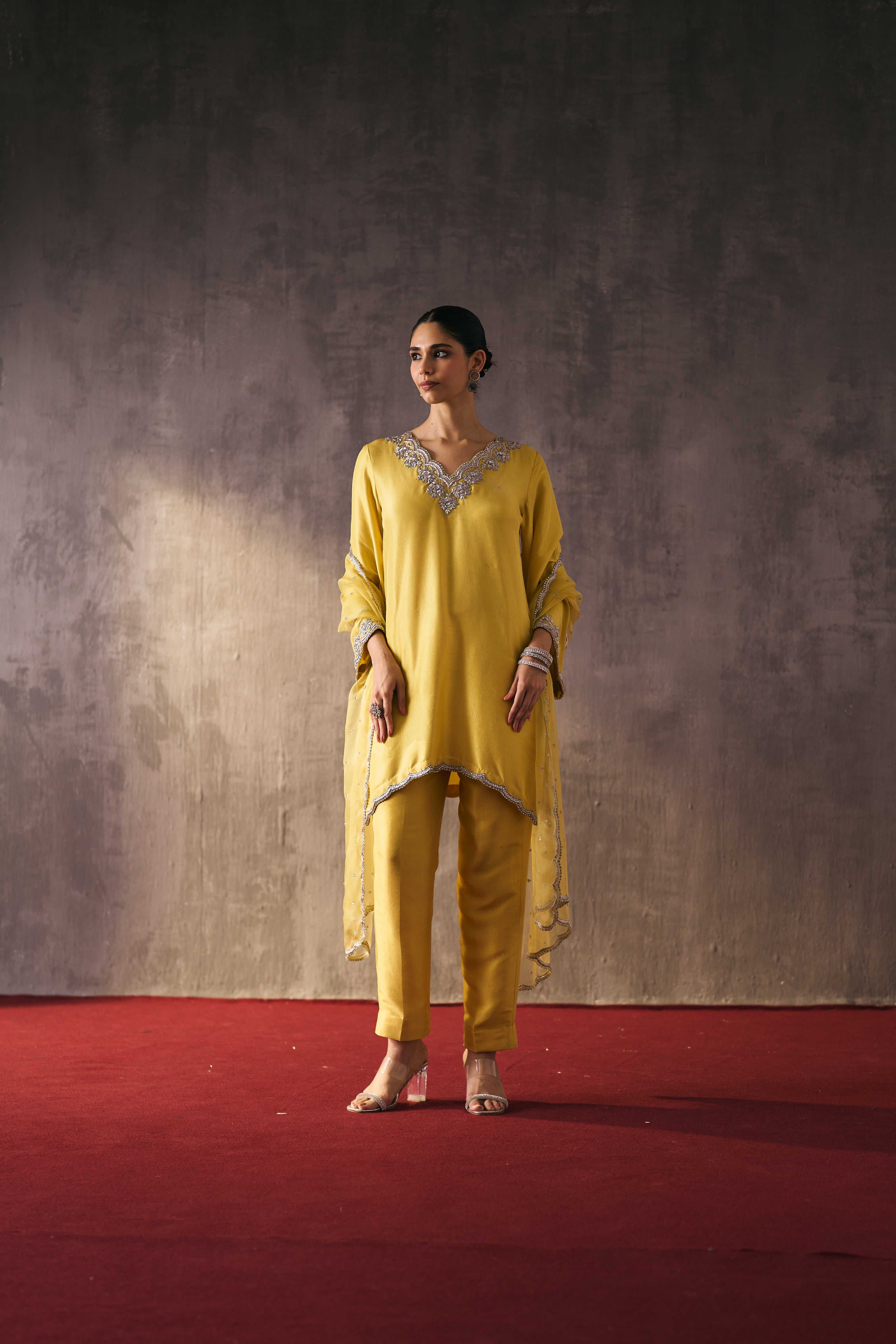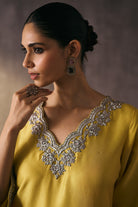 The silk shirt and pants are paired with a sheer organza dupatta, exquisitely hand-embellished with zari, dabka, and crystal detailing. Meticulously handcrafted, this ensemble blends fluid elegance with a luminous, luxe finish—perfect for elevated celebrations.