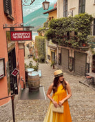 A buttery smooth, one side off shoulder flowy satin dress in yellow ombre shade.