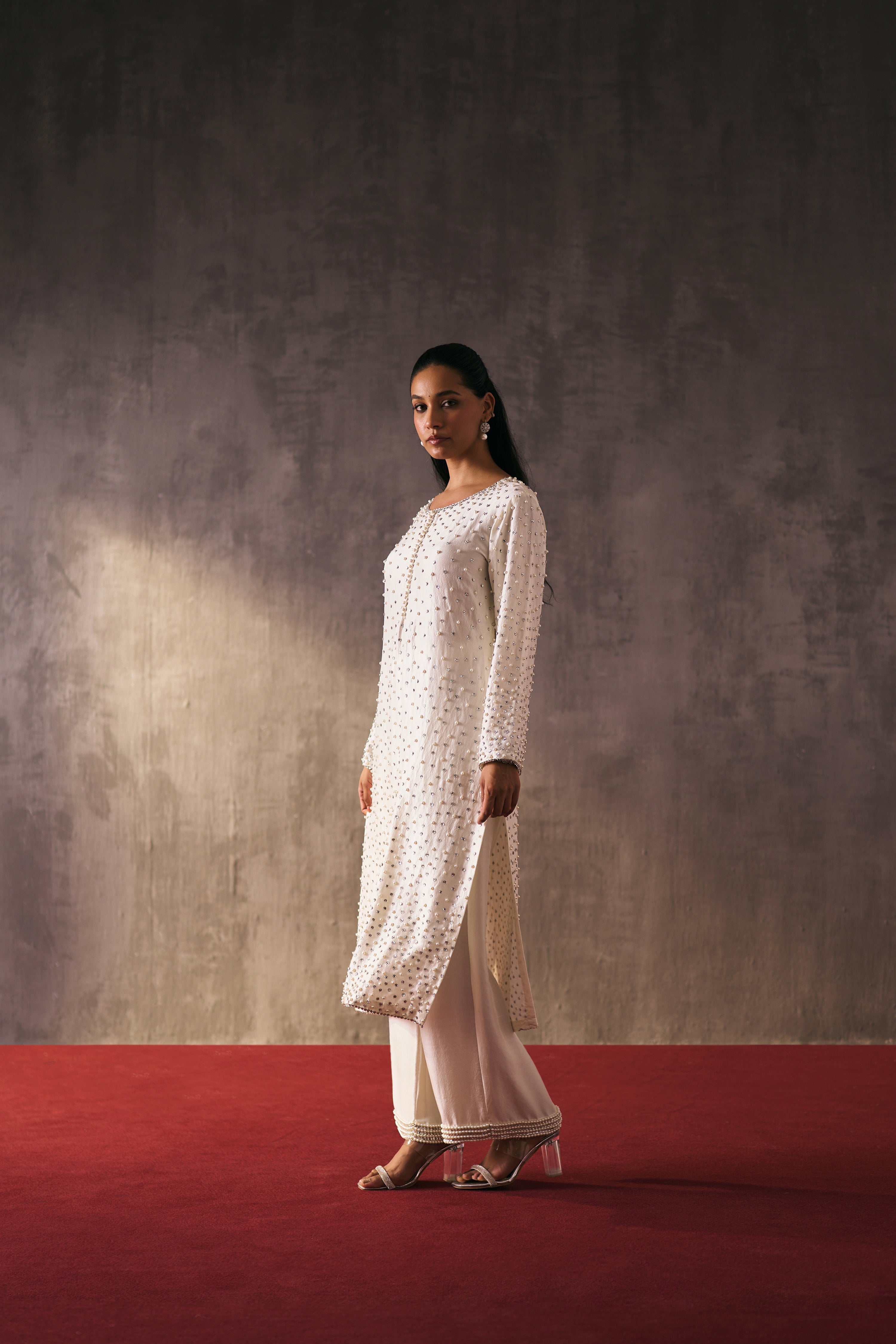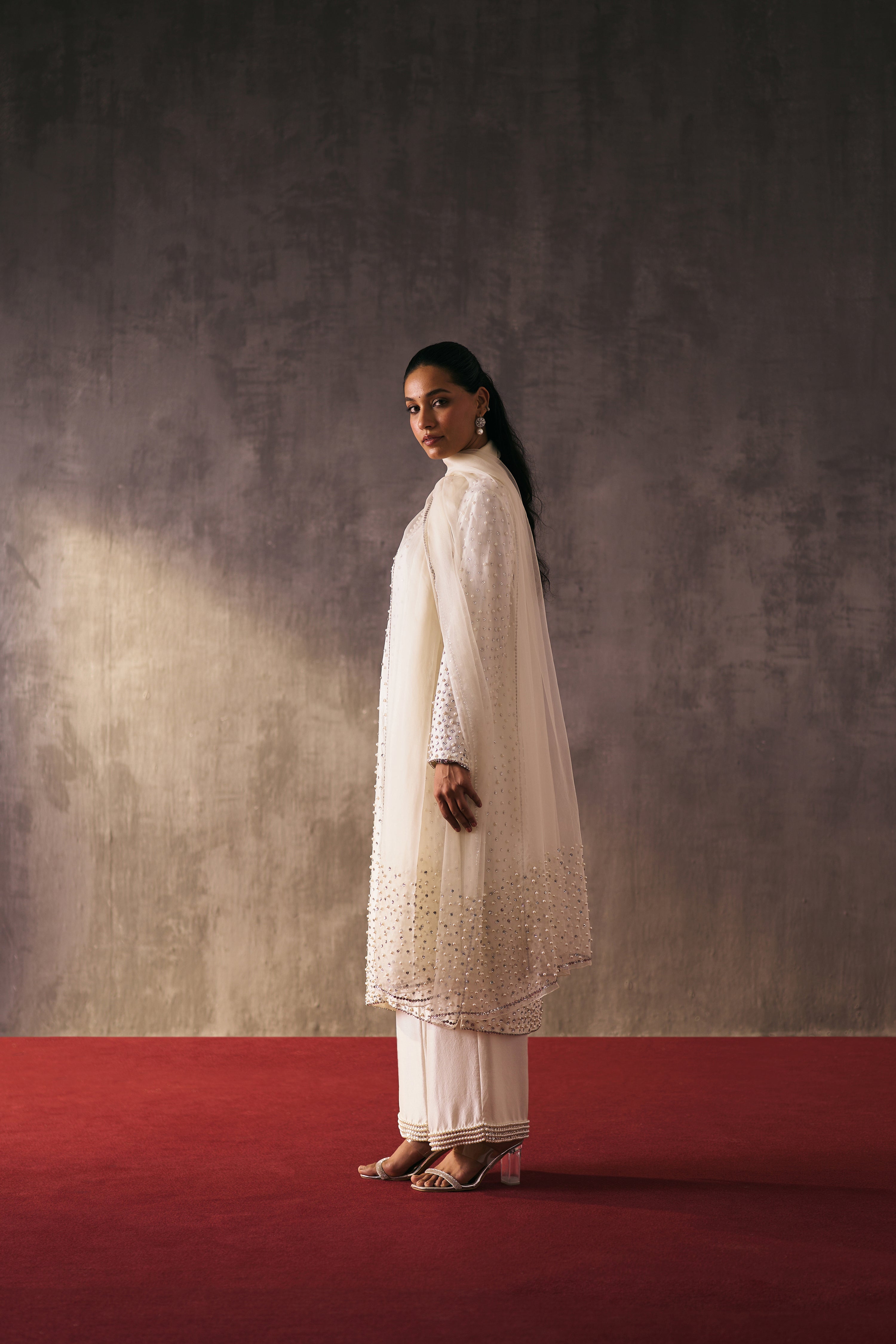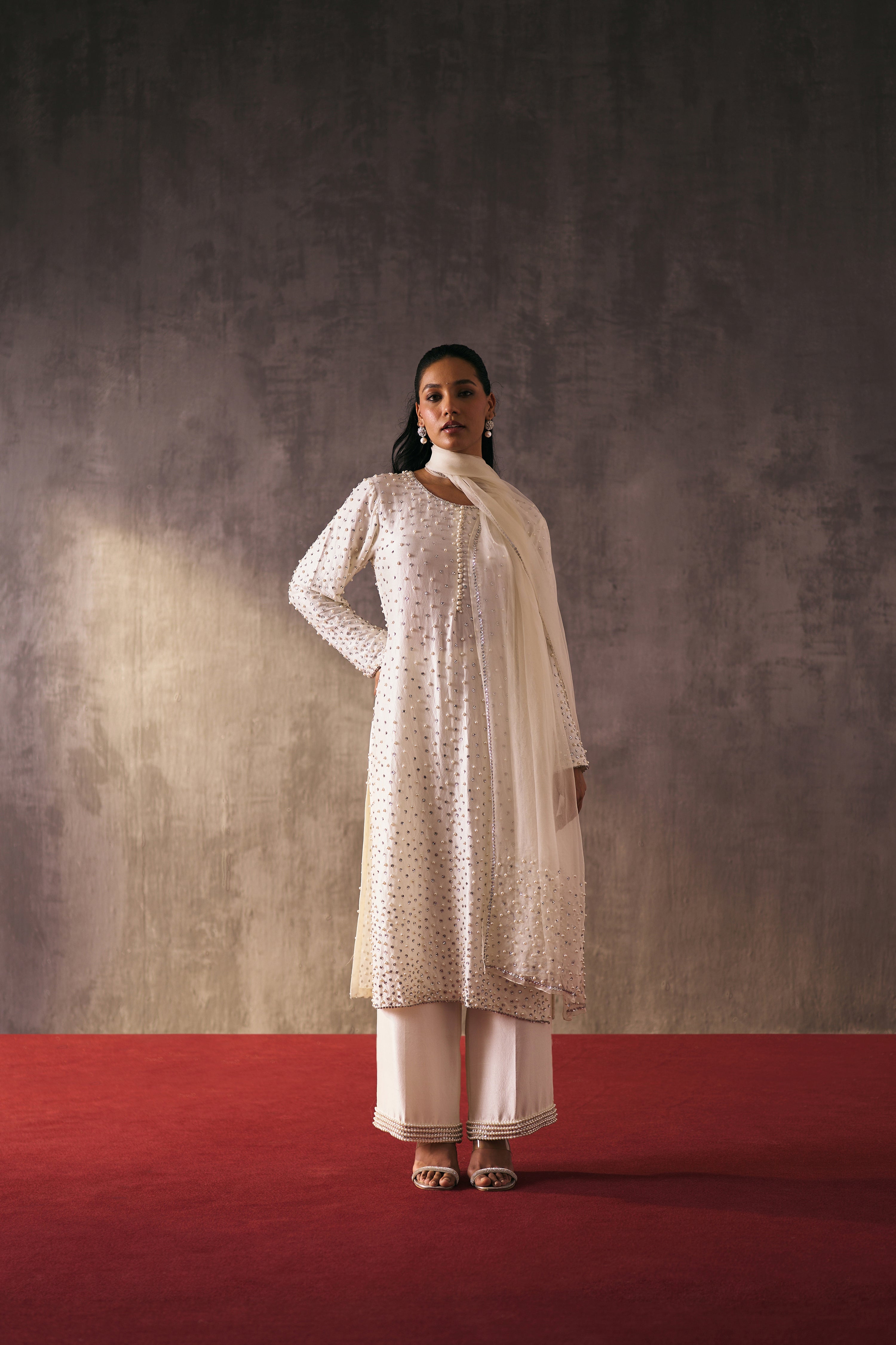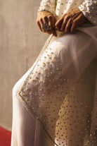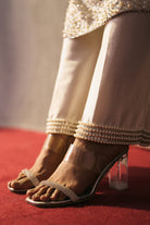The silk shirt and pants are paired with organza dupatta, exquisitely hand-embellished with glass pearls and crystal detailing. Meticulously handcrafted, this ensemble blends fluid elegance with a luminous, luxe finish—perfect for elevated celebrations.