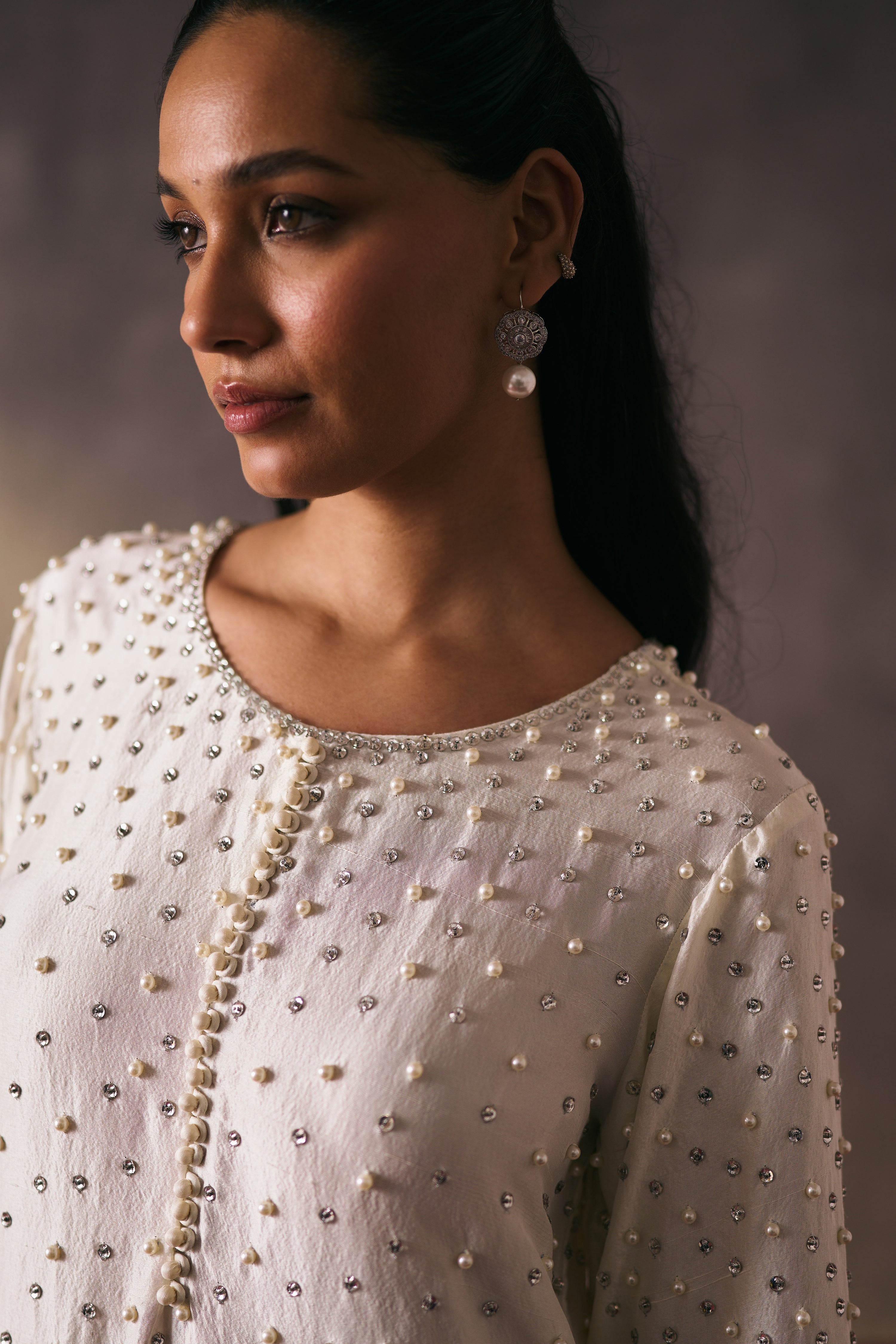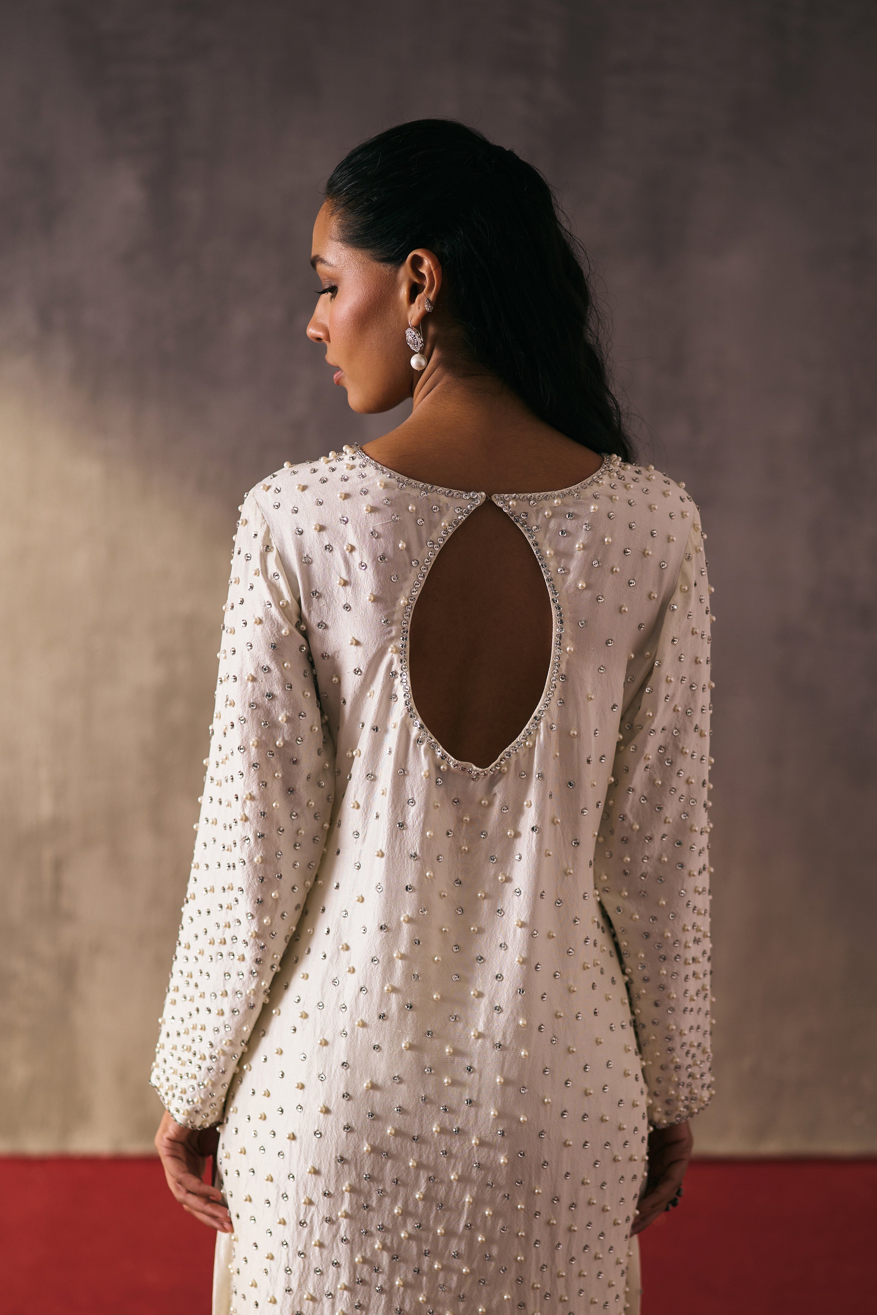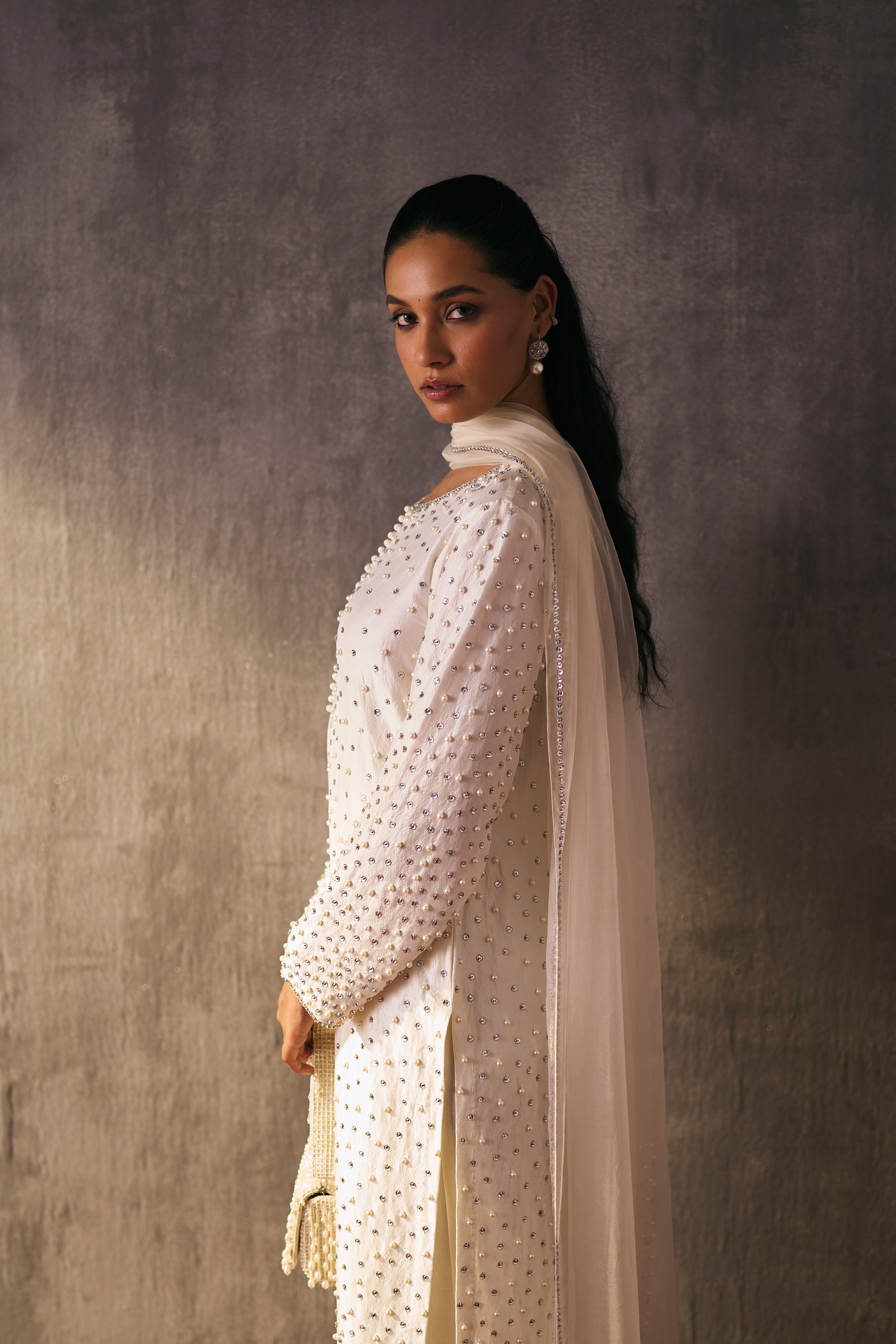 The silk shirt and pants are paired with organza dupatta, exquisitely hand-embellished with glass pearls and crystal detailing. Meticulously handcrafted, this ensemble blends fluid elegance with a luminous, luxe finish—perfect for elevated celebrations.
