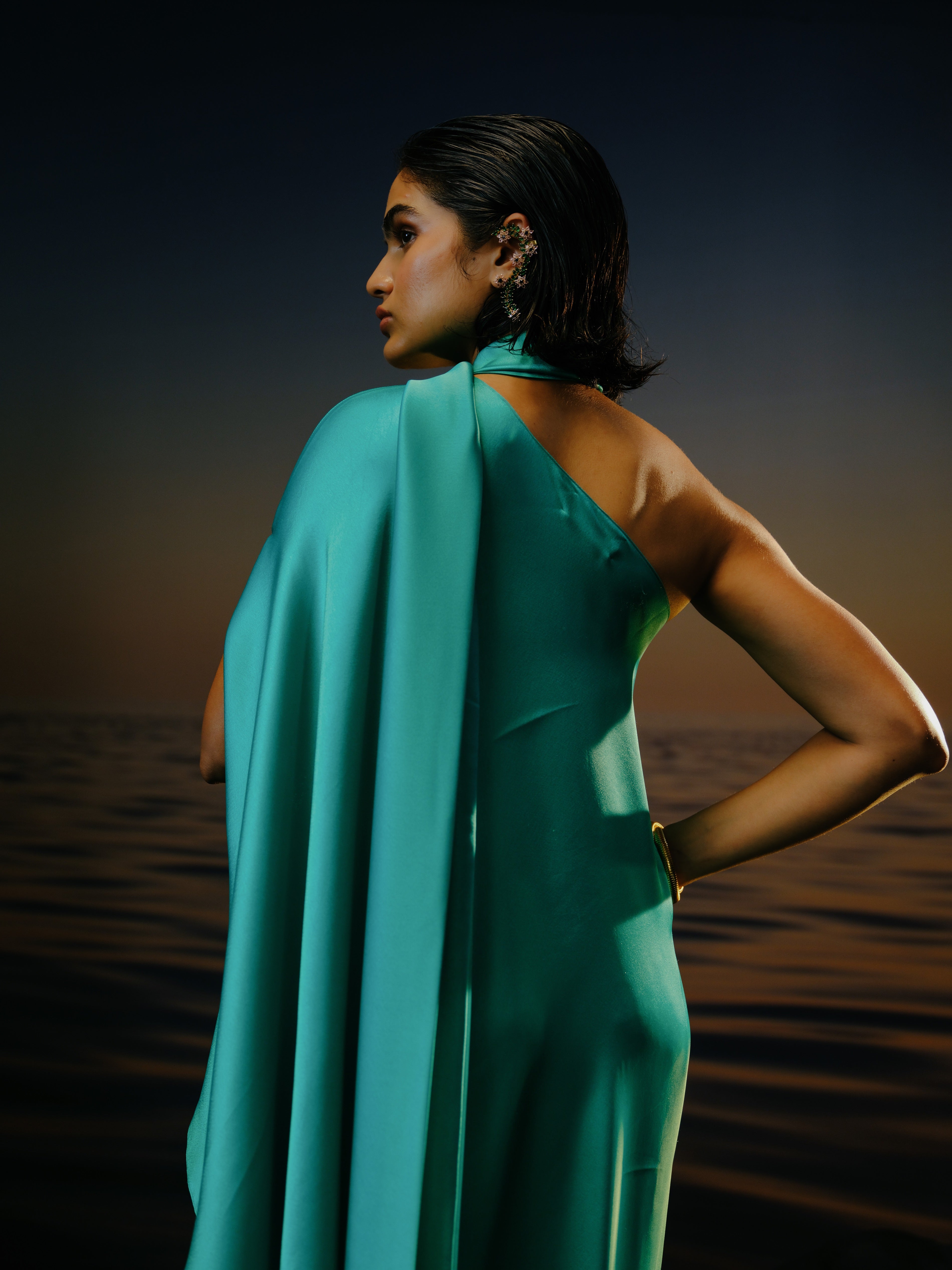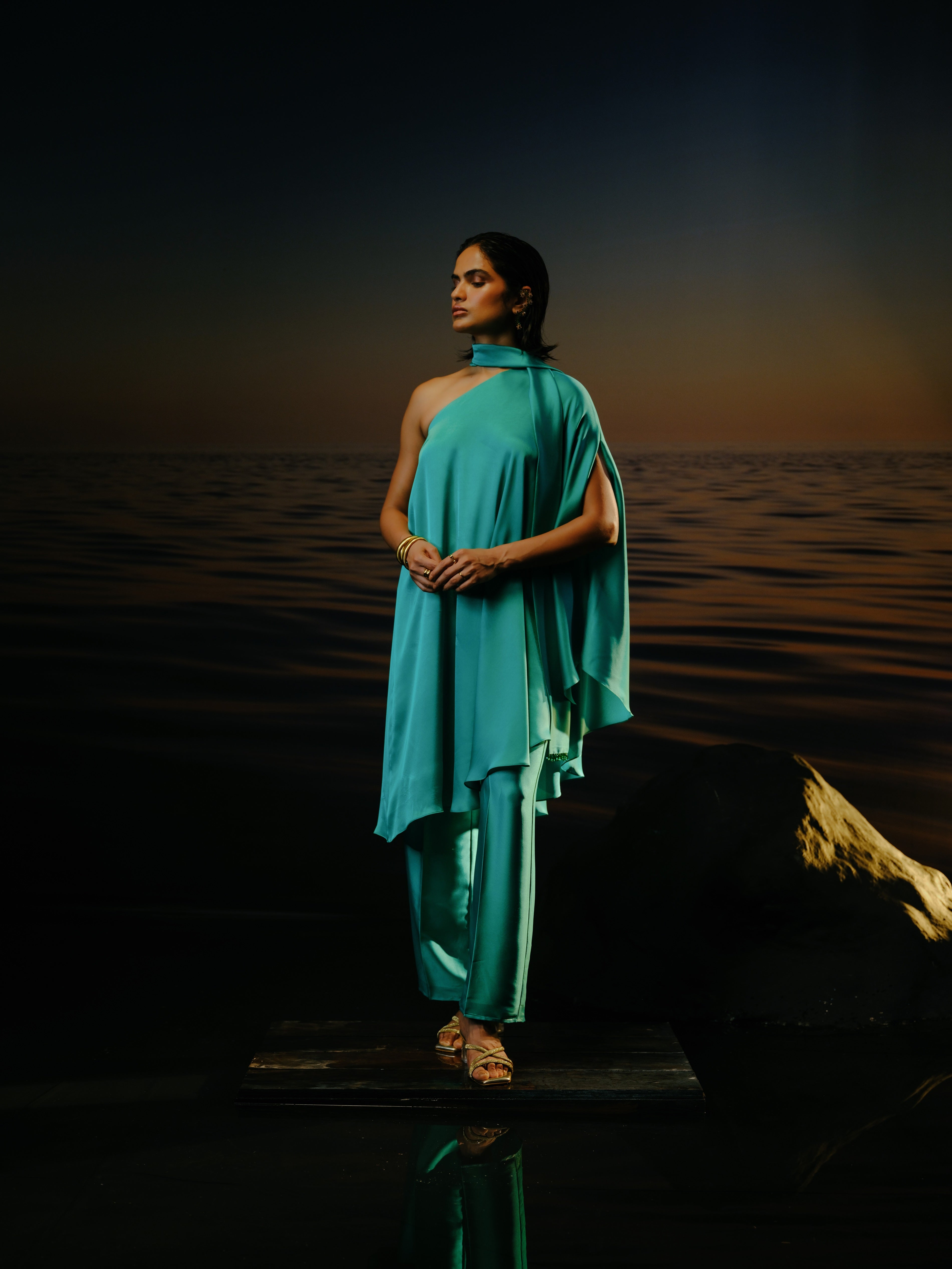 One side off shoulder flowy top with pants and scarf with crystal detailing.