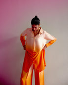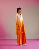 Button-down sunset orange ombré shirt enhanced with crystal buttons paired with ombré pants with front seam detailing.