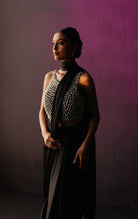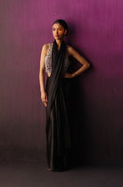 Deep back blouse with delicate pearl droplet detailing with a flowy georgette satin drape.