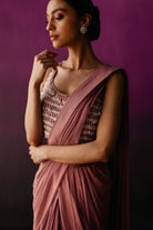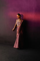 Hand encrusted blouse with baby pink dangling stones with a shimmery palla and pre-draped fish cut skirt.