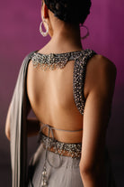 Etched with glass crystal and glass pearl scallop detailing on the blouse, paired with a fish-cut draped skirt in satin with feather and crystal detialing alone the palla.