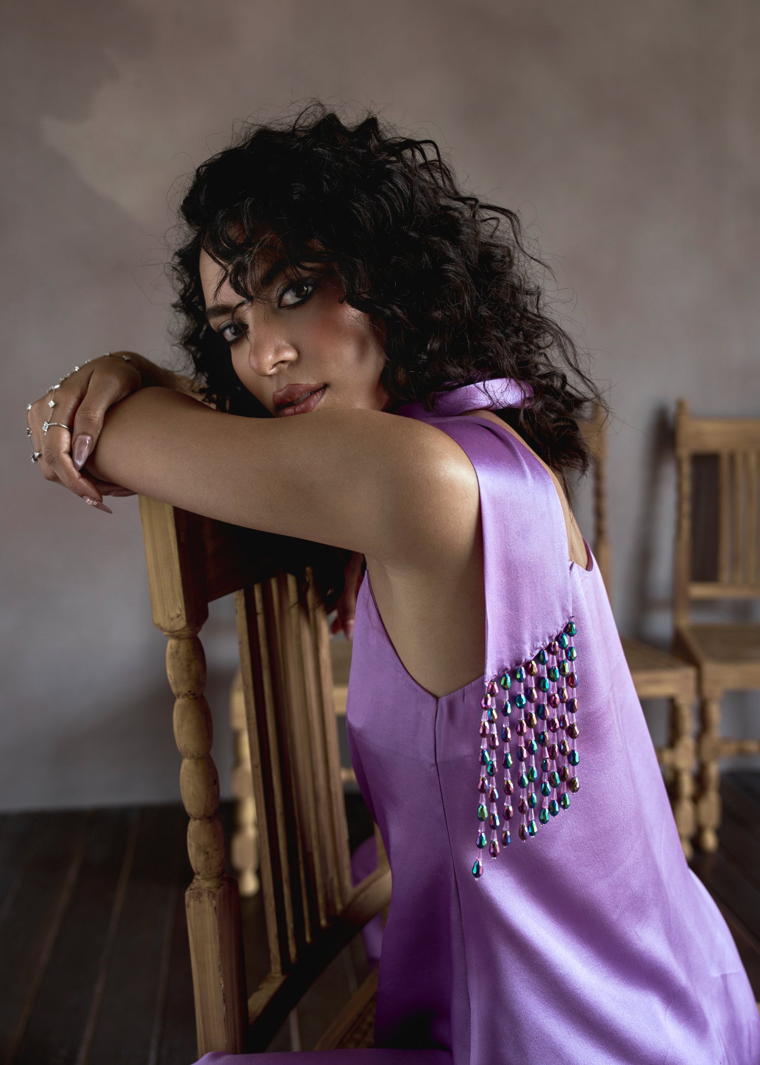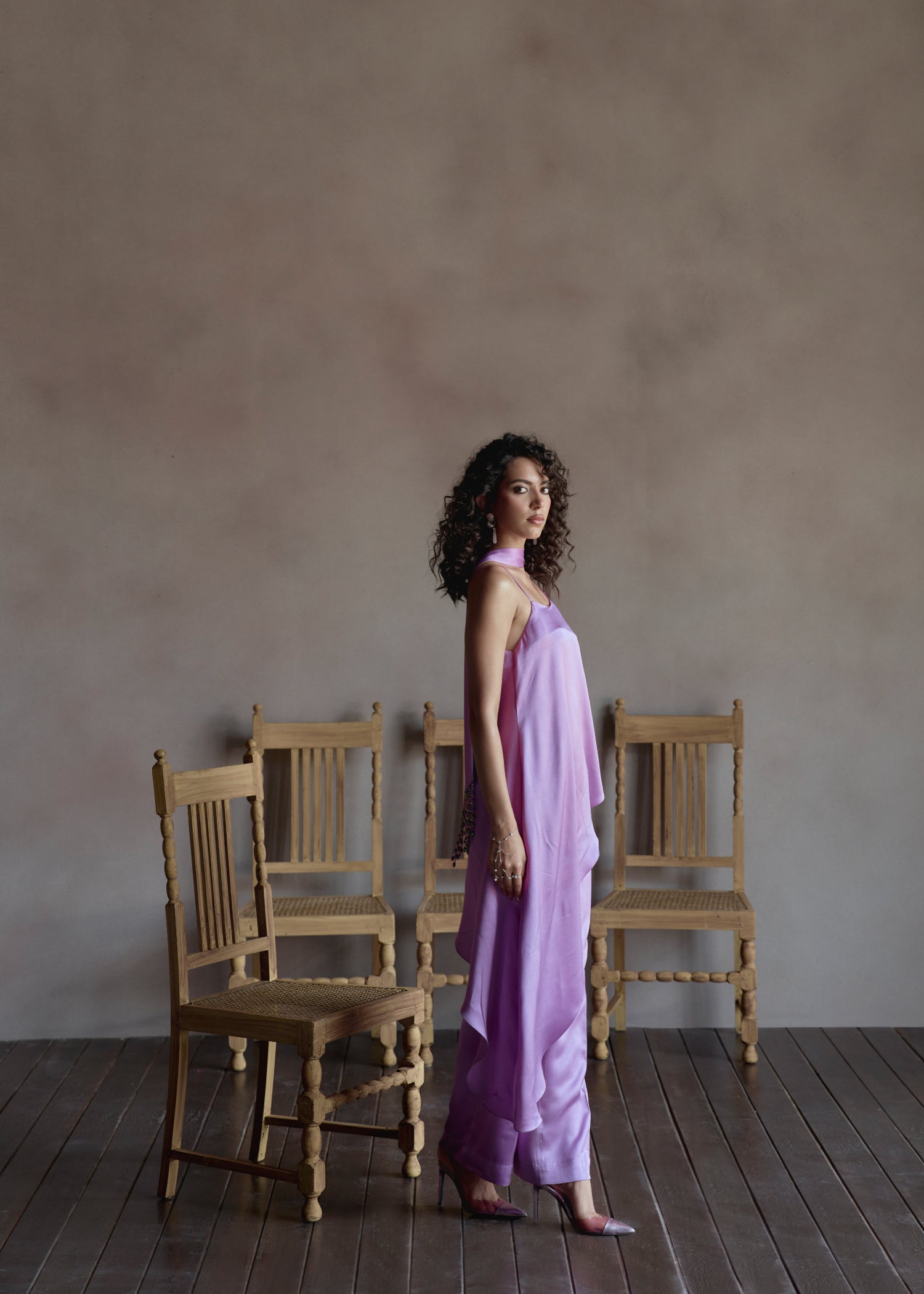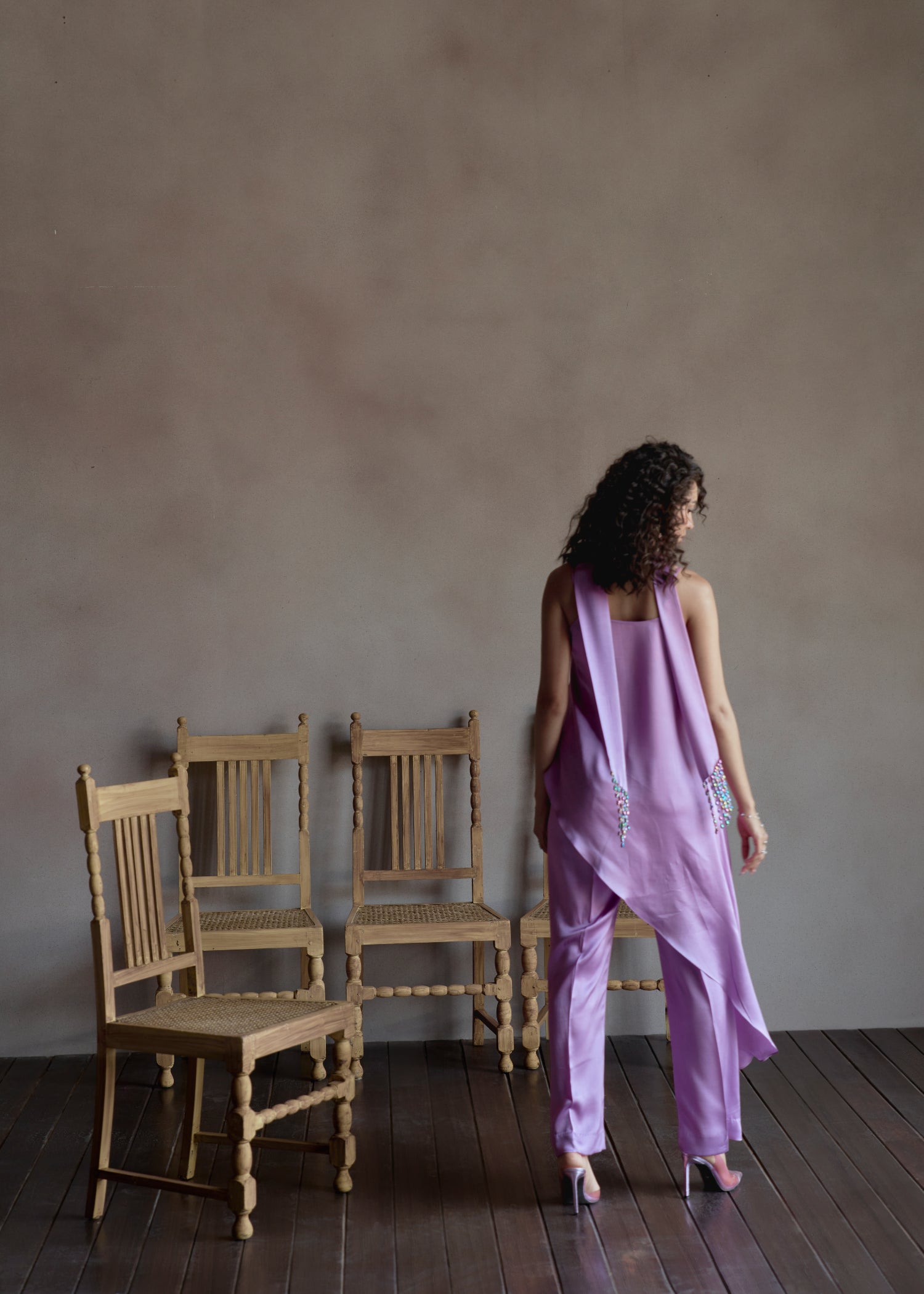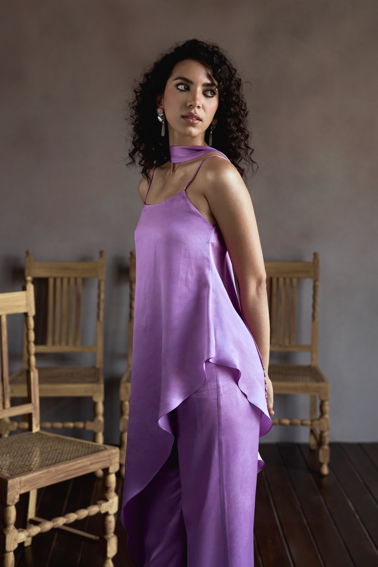 Bias cut strappy top paired with straight pants and crystal embellished scarf for detailing.