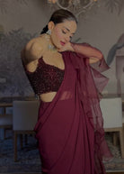 Organza frill drape drama with hand-encrusted wine glass crystals on the blouse for a chandelier effect.