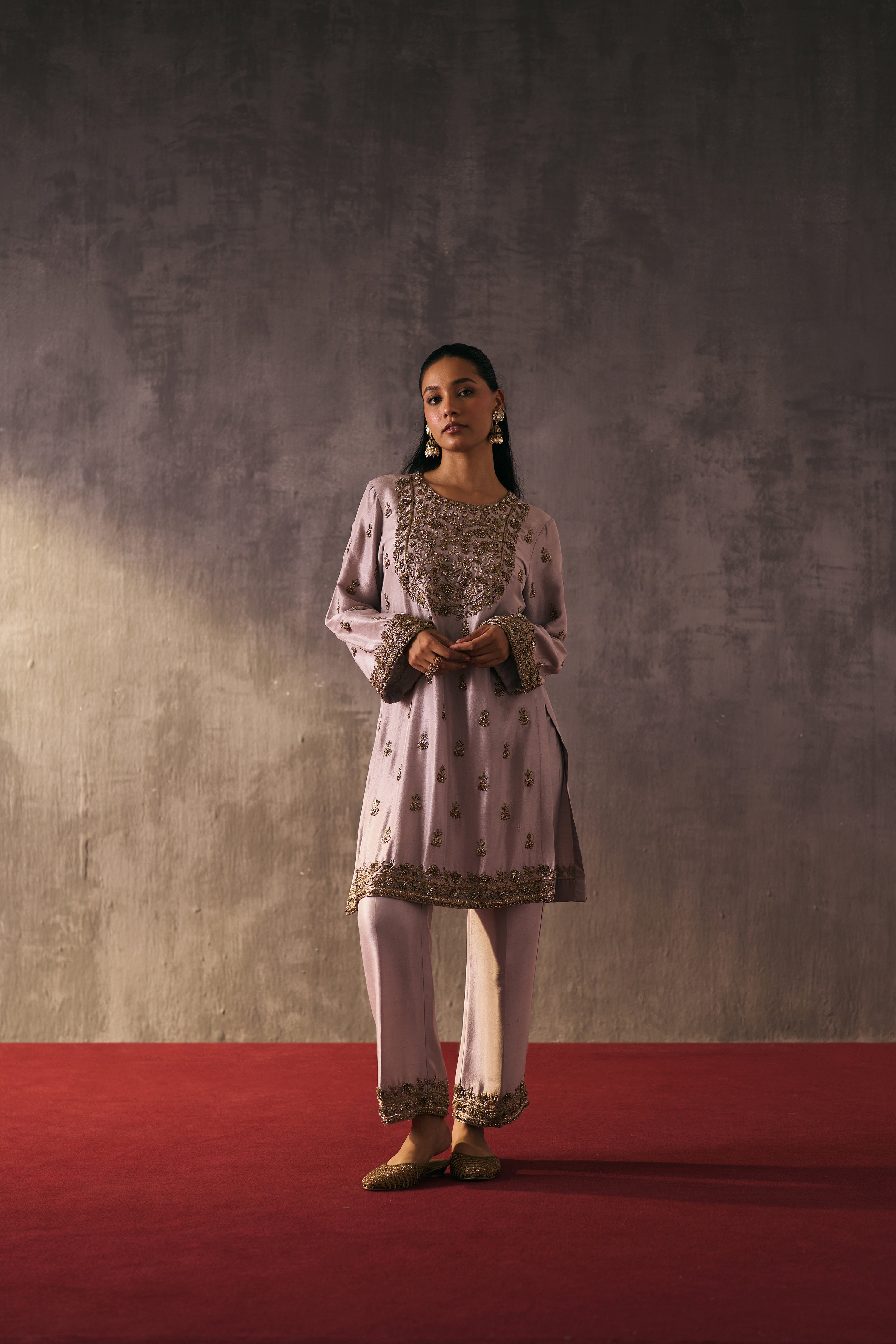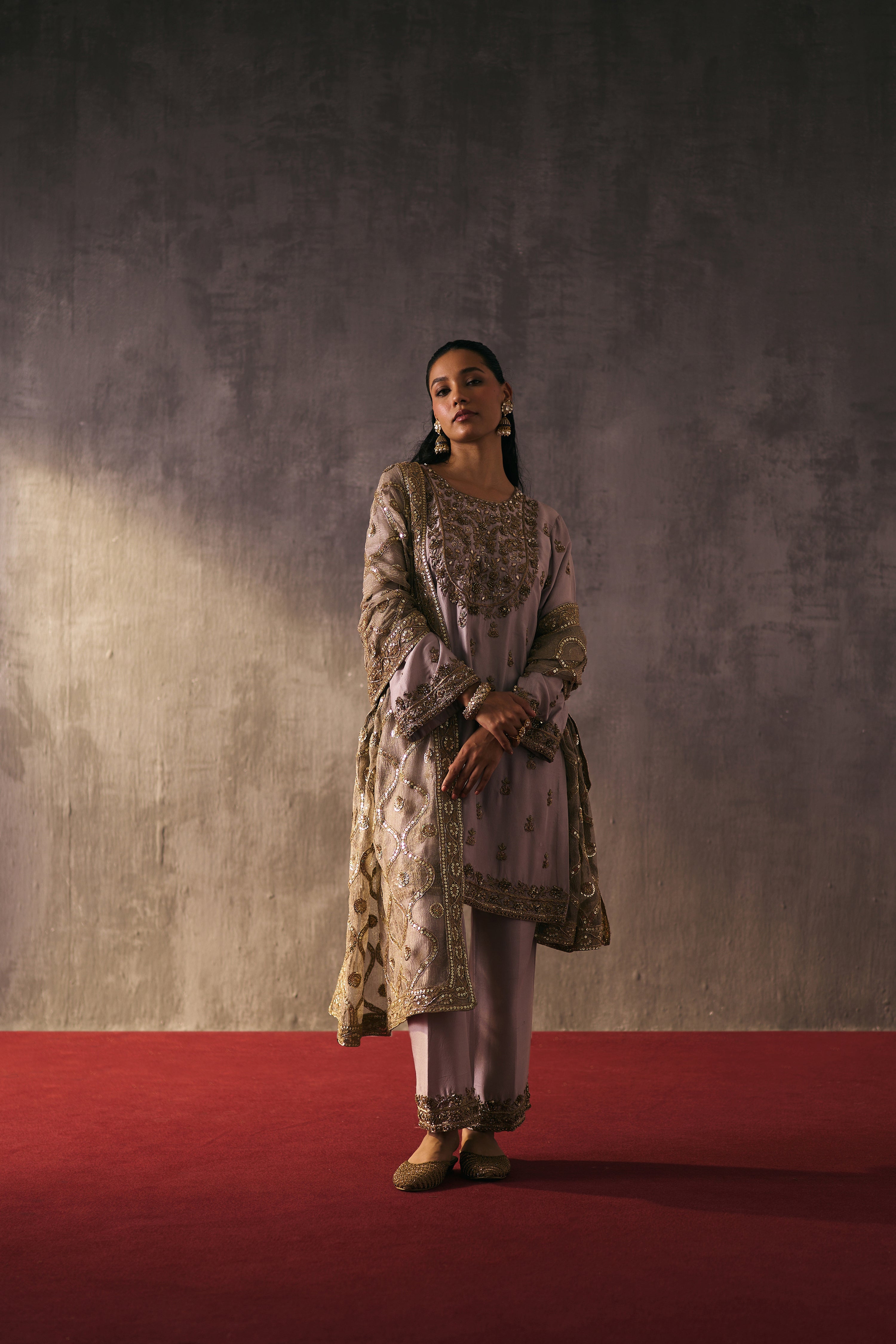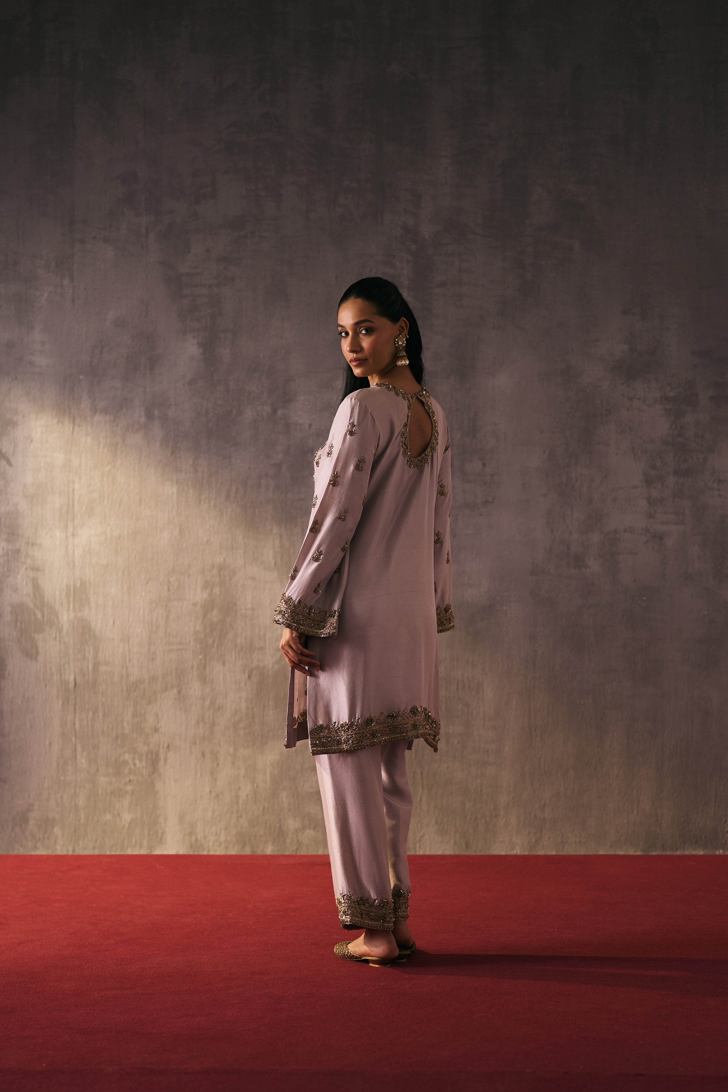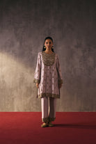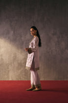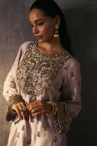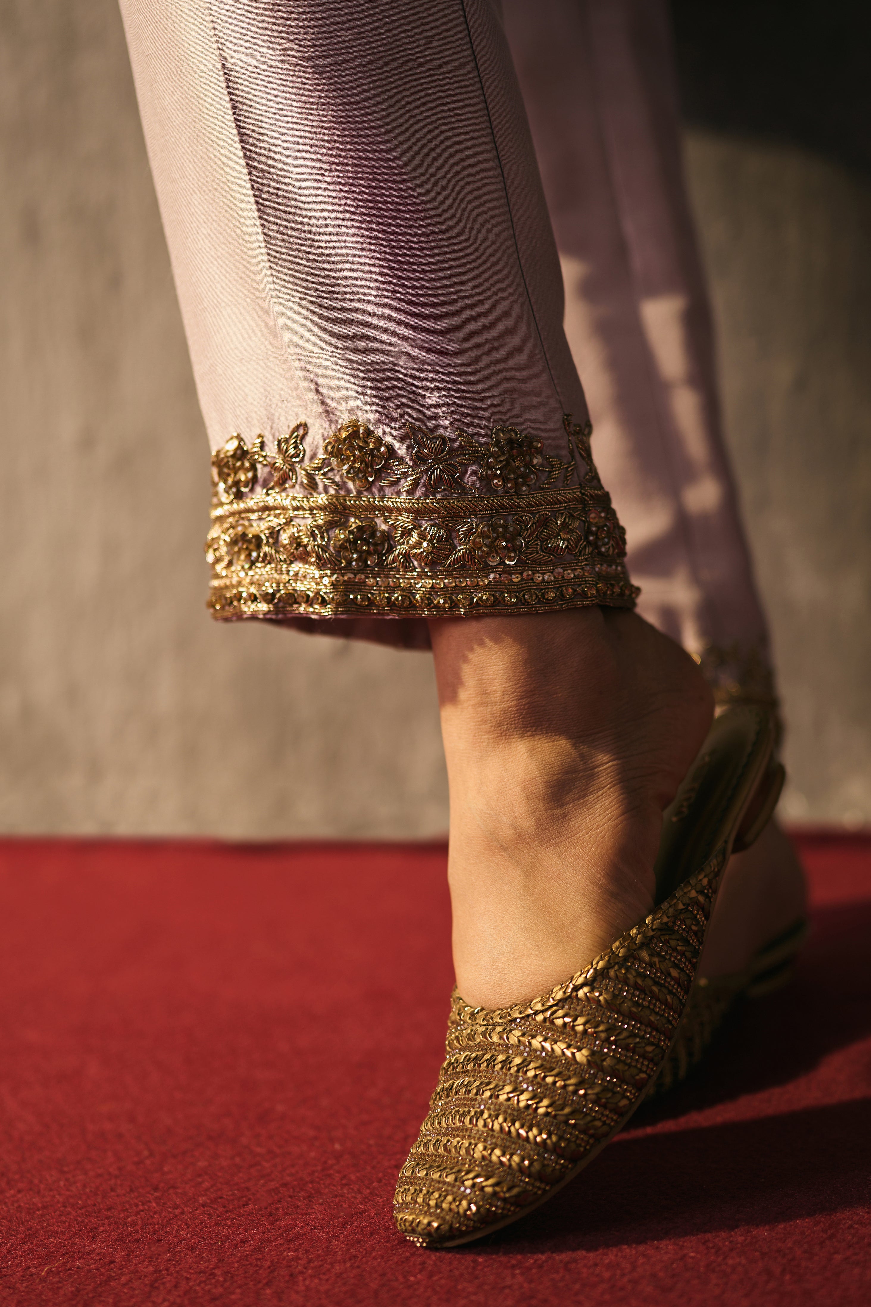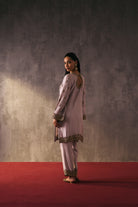 The silk shirt and pants are exquisitely hand-embellished with zari, dabka, and crystal detailing. Meticulously handcrafted, this ensemble blends fluid elegance with a luminous, luxe finish—perfect for elevated celebrations.