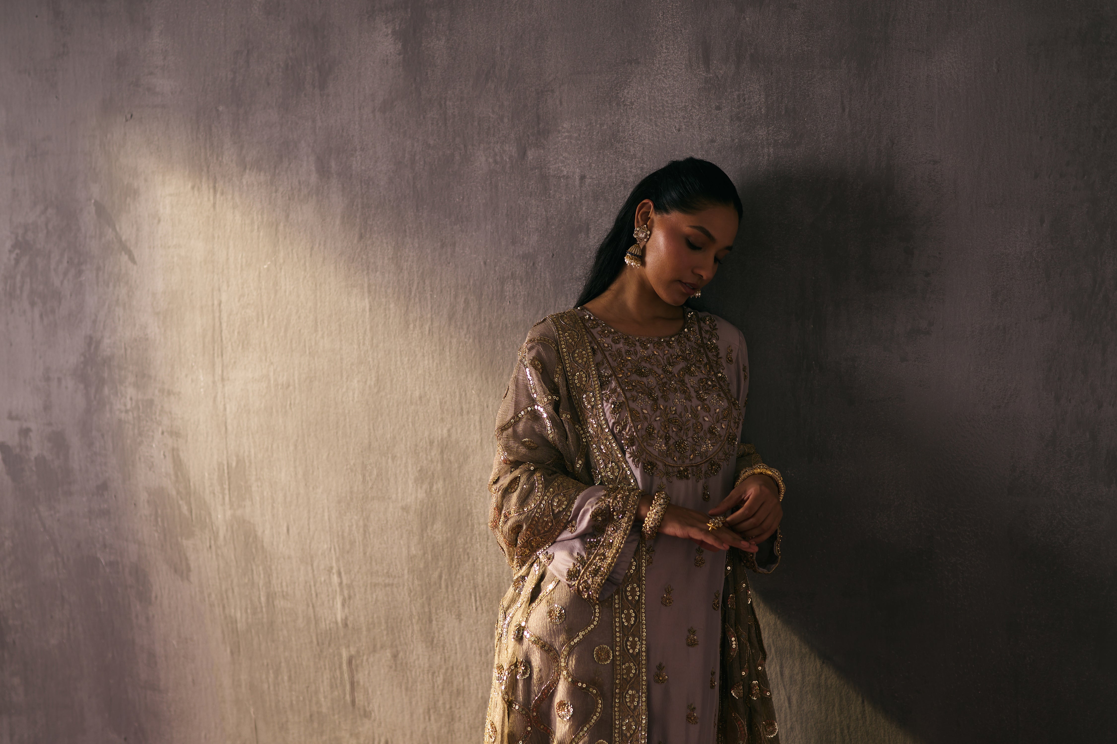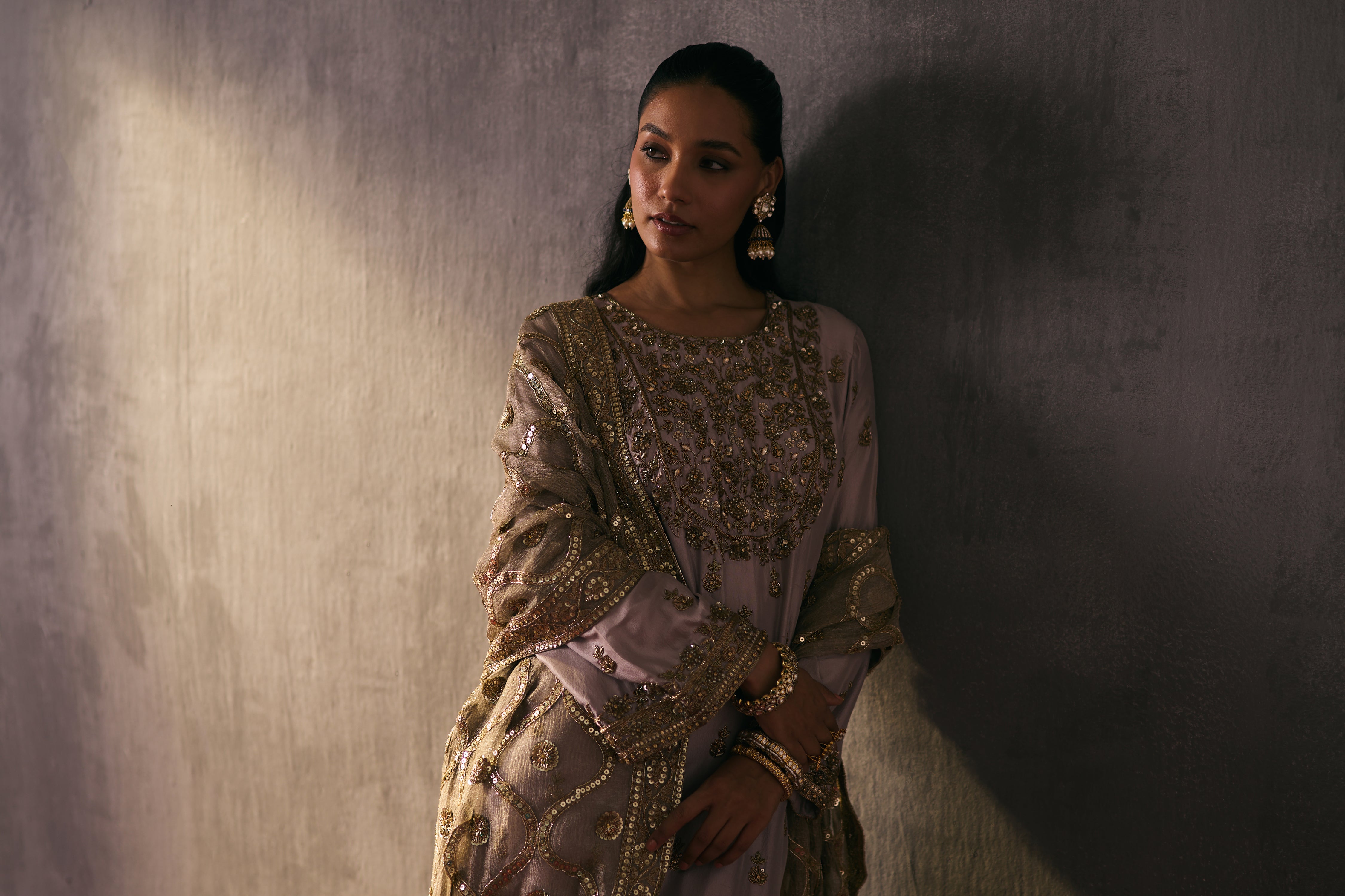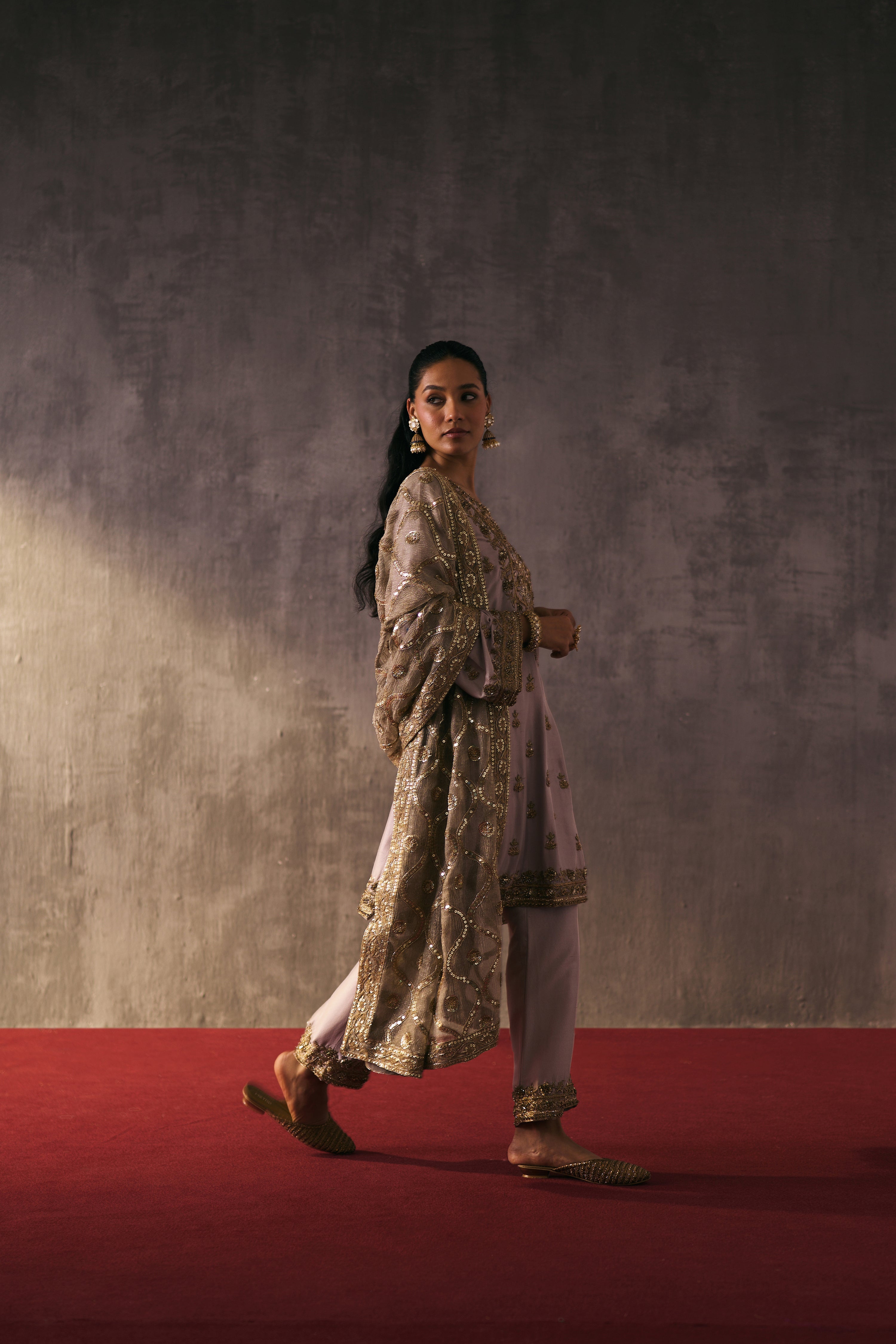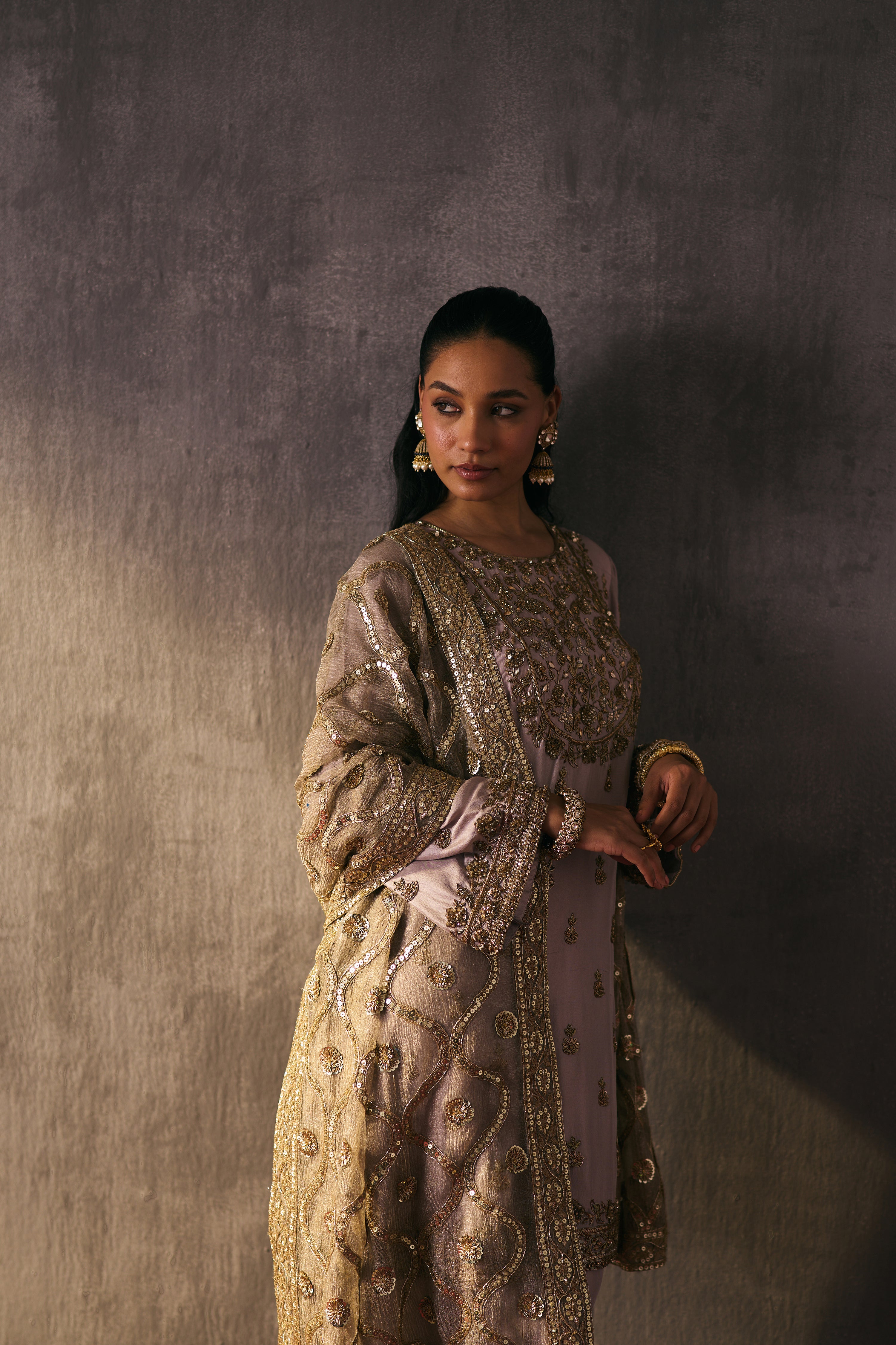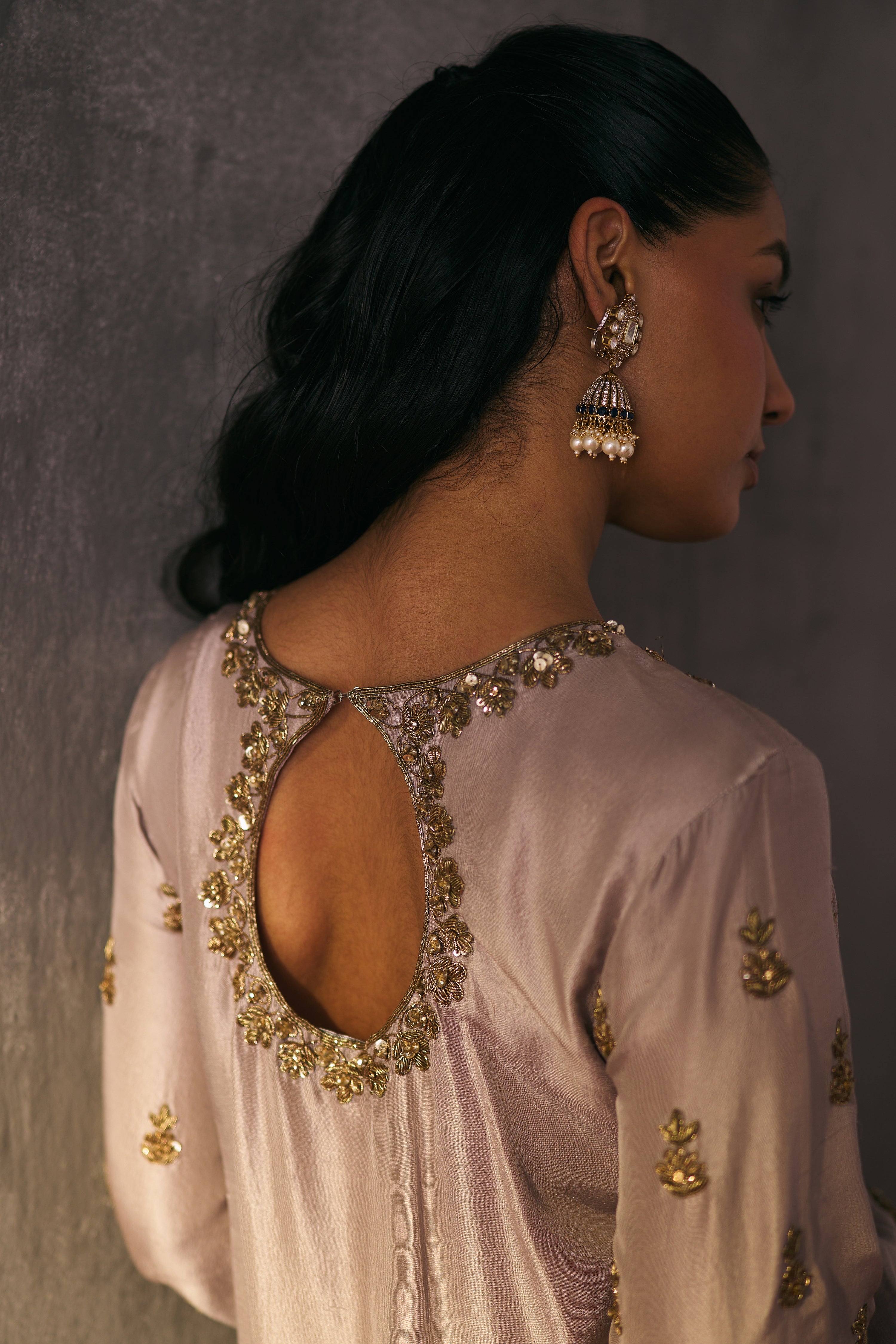 The silk shirt and pants are exquisitely hand-embellished with zari, dabka, and crystal detailing. Meticulously handcrafted, this ensemble blends fluid elegance with a luminous, luxe finish—perfect for elevated celebrations.