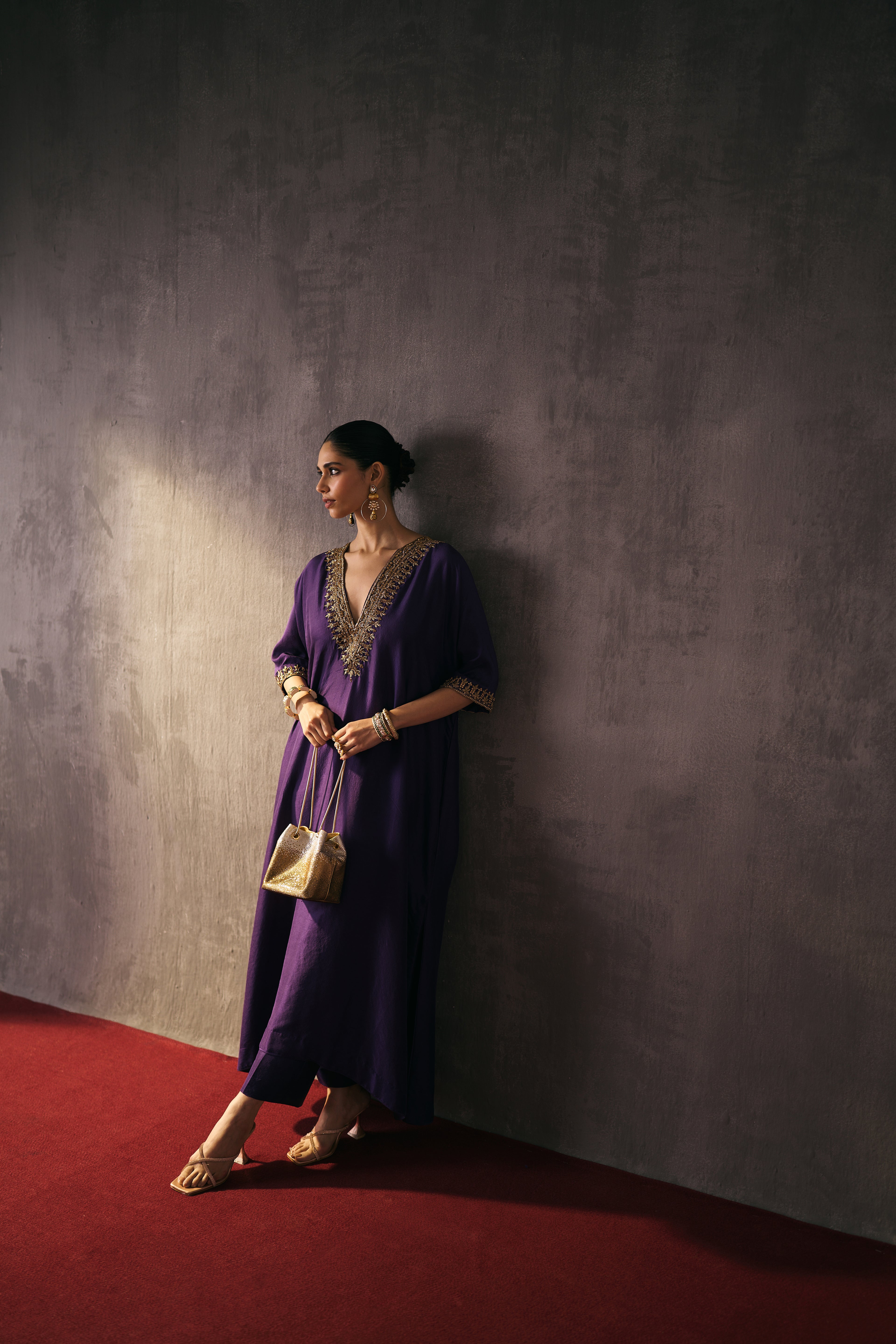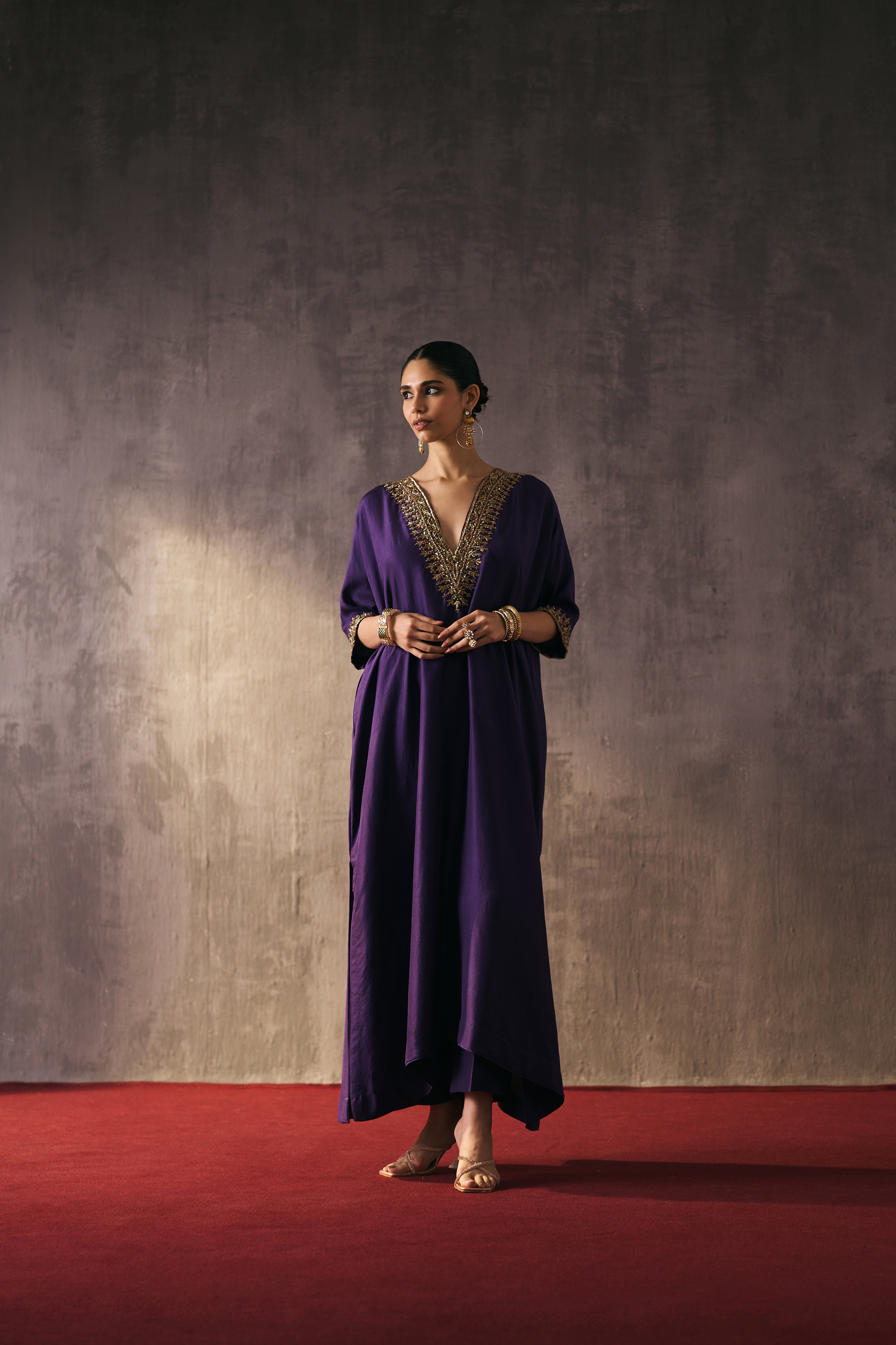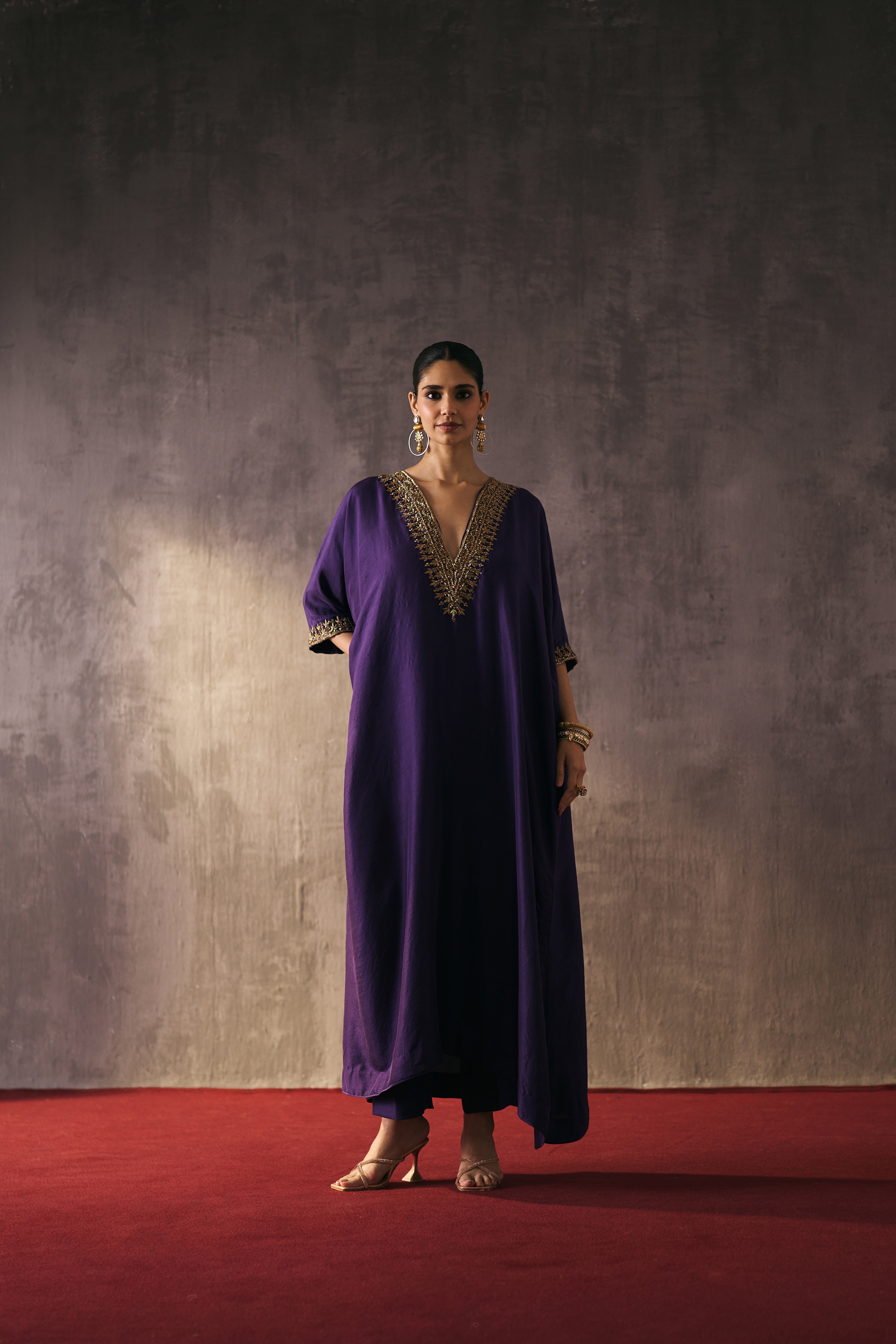 Crafted in pure silk, these flowy, loose-fit kaftans come paired with straight pants — a silhouette of modern ease. Hand-embellished with zari, dapka, and delicate glass accents, each piece is a work of art designed for festive evenings and timeless celebrations.